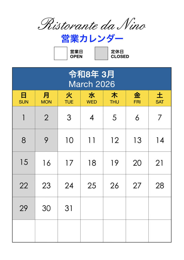 Home 未分類 3月の営業カレンダー 3月の営業カレンダー 2026.02.28 未分類 お客様各位平素よりご愛顧いただき、誠にありがとうございます。令和8年3月の営業日程をご案内いたします。ご来店を心よりお待ちしております。*****Dear Guests,Thank you for your continued patronage.Please find our schedule for March 2026.We look forward to welcoming you soon.